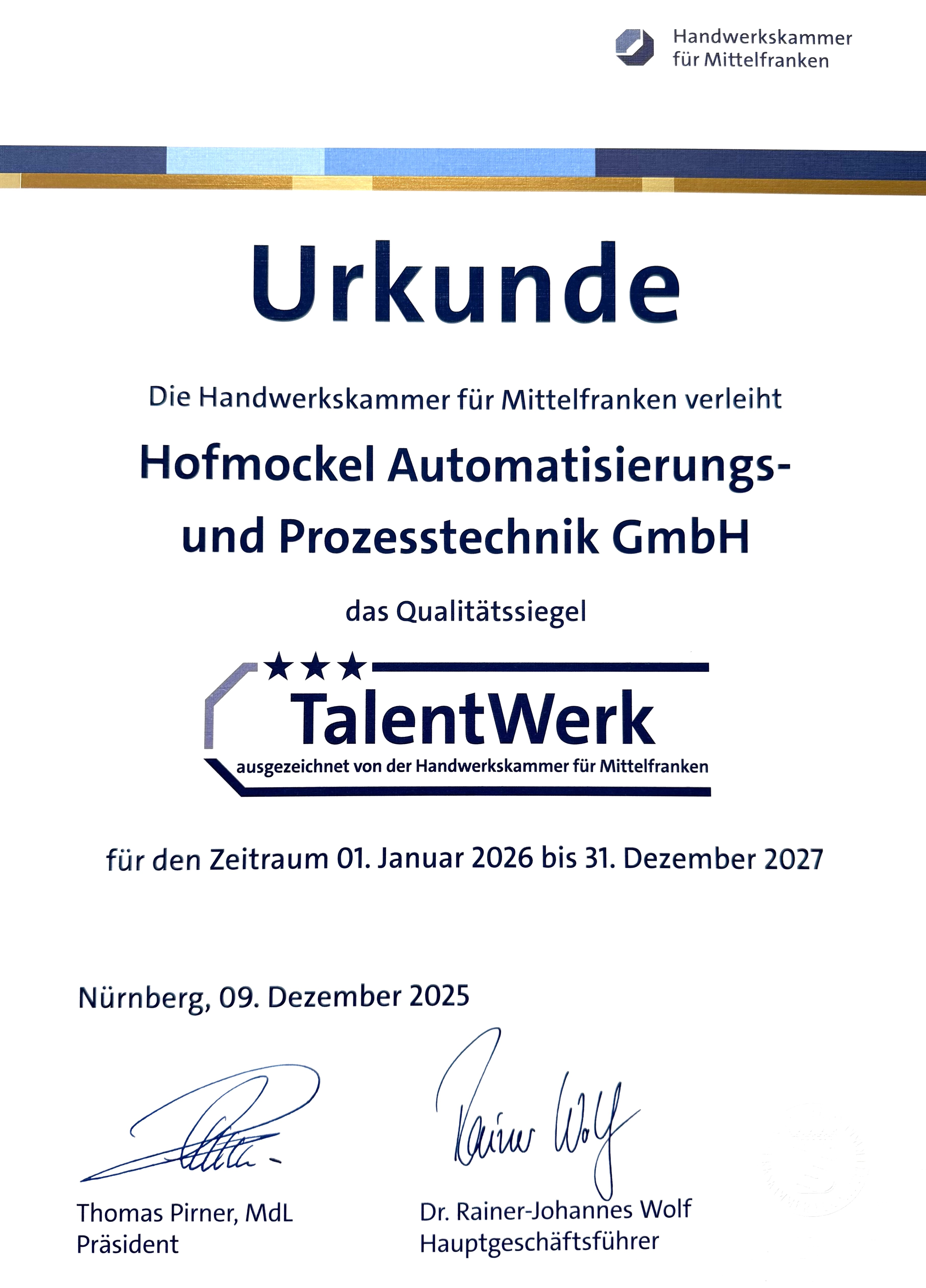 Hofmockel Automatisierungs- und Prozesstechnik GmbH erhält das Qualitätssiegel „TalentWerk“